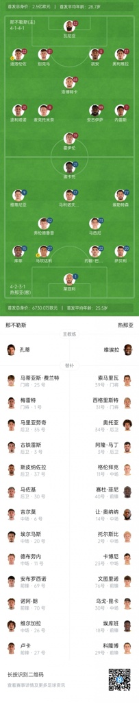 那不勒斯首发:32-瓦尼亚、22-迪洛伦佐、31-别克马、5-胡安、17-奥利维拉、99-安古伊萨、68-洛博特卡、8-麦克托米奈、21-波利塔诺、19-霍伊伦、7-内雷斯